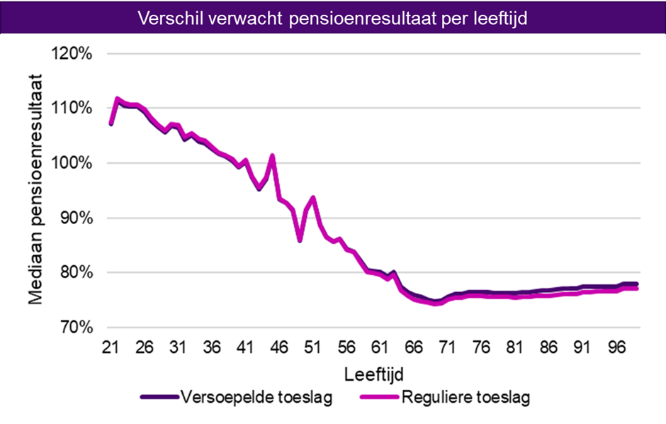 Het toekennen van de toeslagen per 1 januari 2026 heeft gevolgen voor de pensioenresultaat. Dit zijn de uiteindelijk te verwachte pensioenen op de langere termijn. In de onderstaande grafiek ziet u het verschil in verwacht pensioenresultaat per leeftijdsgroep.